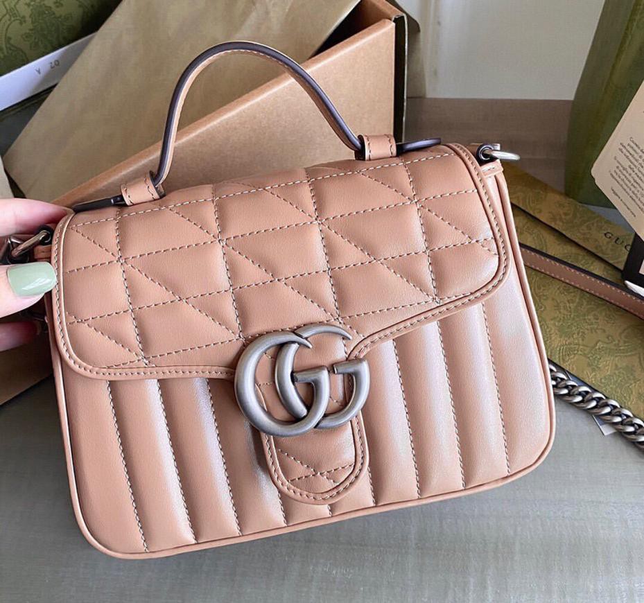 Fivela com duplo G exclusivo, ferragem prateada, efeito matelassê, recortes em matelassê, parte superior dobrável com fecho magnético, alça de mão única reta, alça de ombro removível em couro e corrente, compartimento principal e bolso interno.